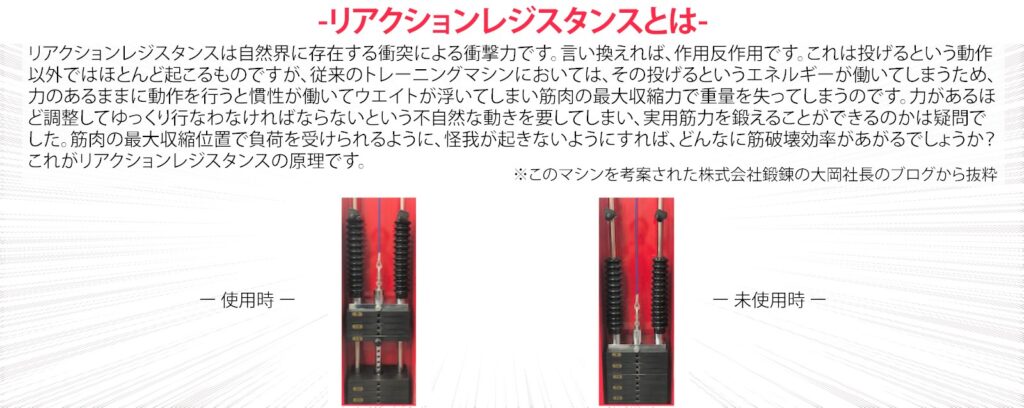 「リアクションレジスタンス」はトレーニングする誰もが筋力トレーニングの効果を最大限に引き出す事を目的に研究開発された画期的なシステムです。