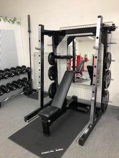 鍛錬のモンスターベンチを使い、ベンチプレス、インクラインプレスができます。またバーベルスクワット、デッドリフト等、さまざまなトレーニングが可能です。